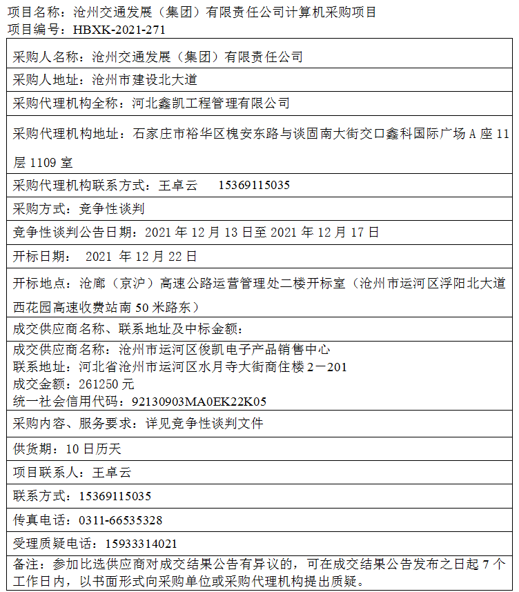 滄州交通發(fā)展(集團(tuán))有限責(zé)任公司計算機采購項目 成交結(jié)果公告