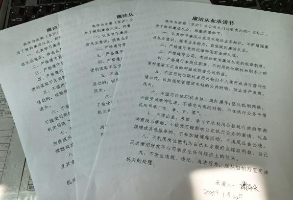 三是組織全體職工簽訂《2025年廉潔從業(yè)承諾書》,要求經(jīng)常性對照承諾書進(jìn)行自我檢查、自我警示、自我約束,把心思傾注在本職工作中,確保廉潔從業(yè),筑牢從業(yè)思想防線。