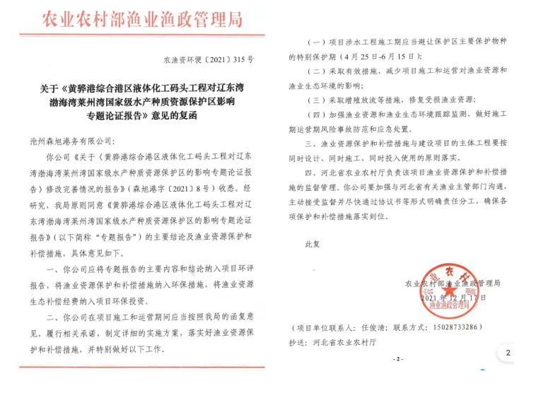 近日,《黃驊港綜合港區(qū)液體化工碼頭工程對遼東灣渤海灣萊州灣國家級水產(chǎn)種質(zhì)資源保護區(qū)影響專題論證報告》取得了農(nóng)業(yè)農(nóng)村部的批復(fù)。農(nóng)業(yè)農(nóng)村部批復(fù)的取得加快了液體化工碼頭工程項目前期手續(xù)跑辦的進度,為項目開工建設(shè)奠定了堅實基礎(chǔ)。