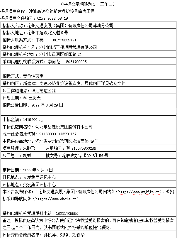津汕高速公路新建養(yǎng)護(hù)設(shè)備庫房工程中標(biāo)公告