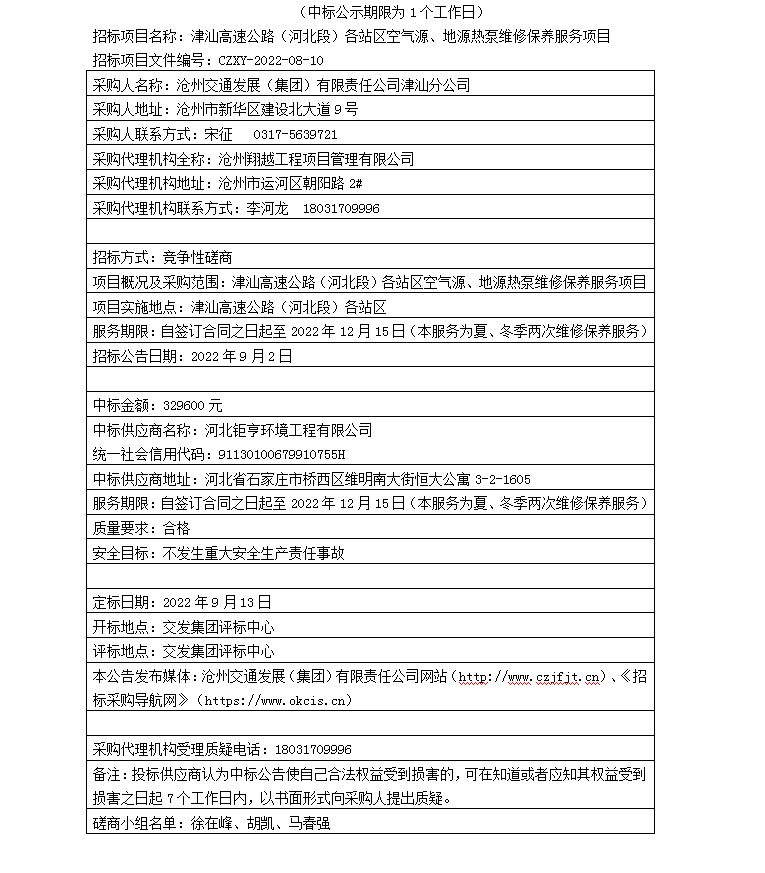 津汕高速公路(河北段)各站區(qū)空氣源、地源熱泵維修保養(yǎng)服務項目中標公告
