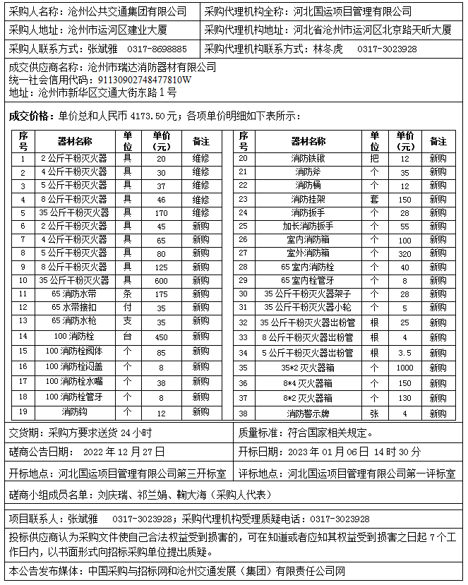 滄州公共交通集團有限公司消防設備采購及維護采購項目成交公告