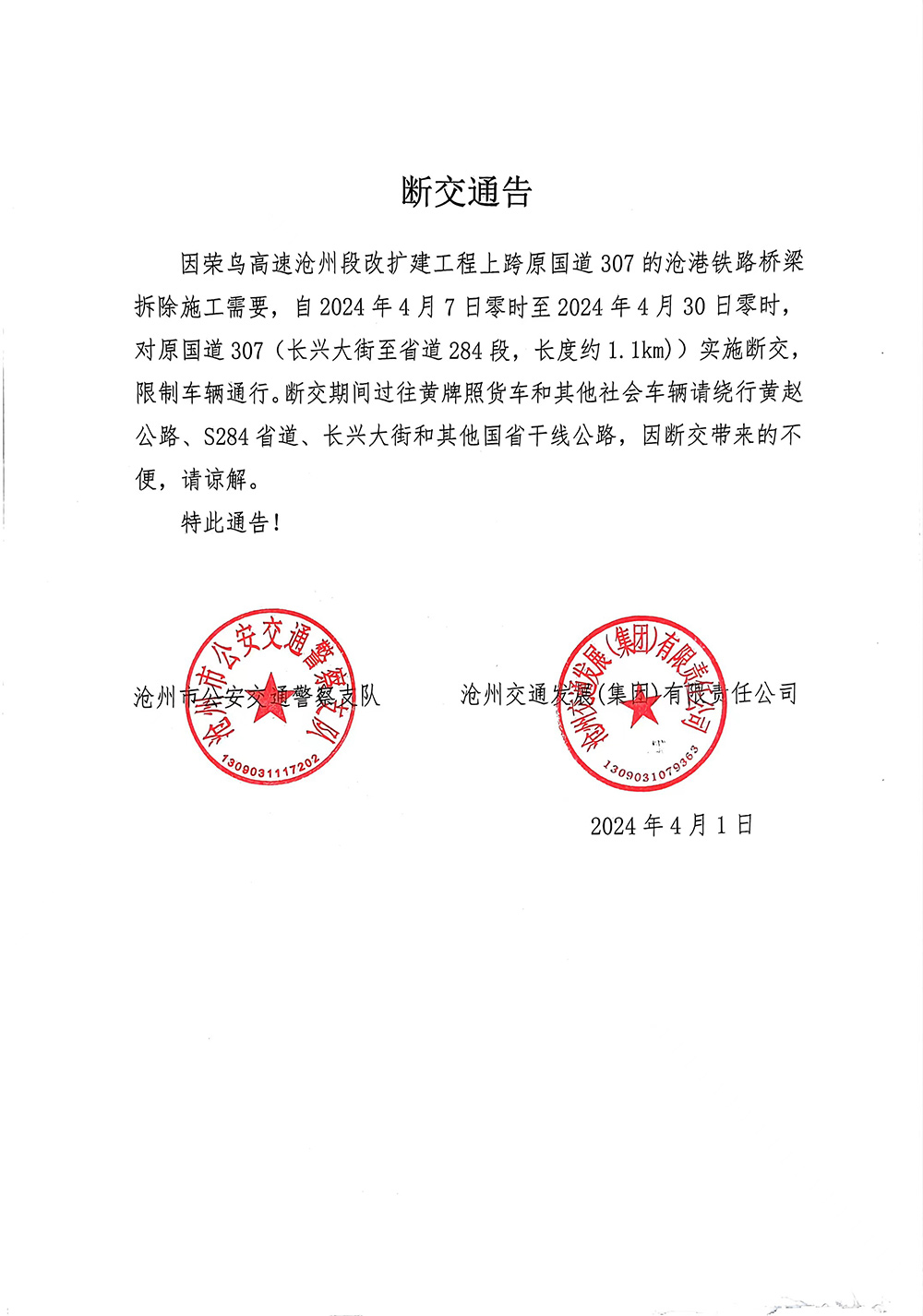 斷交通告