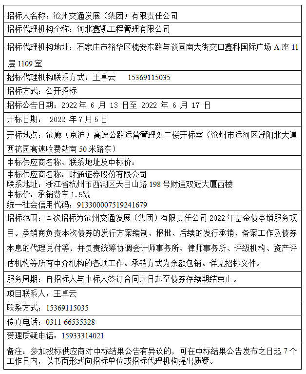 滄州交通發(fā)展(集團)有限責任公司2022年基金債承銷服務項目 中標結果公告