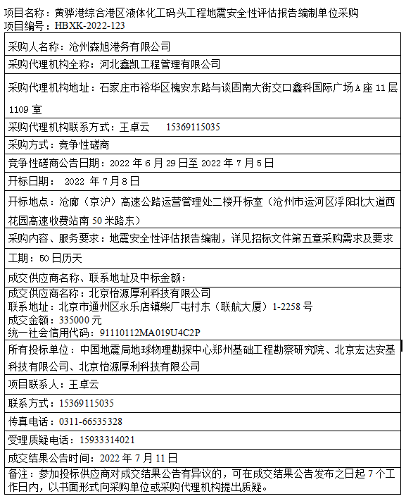 黃驊港綜合港區(qū)液體化工碼頭工程地震安全性評(píng)估報(bào)告編制單位采購(gòu)成交結(jié)果公告