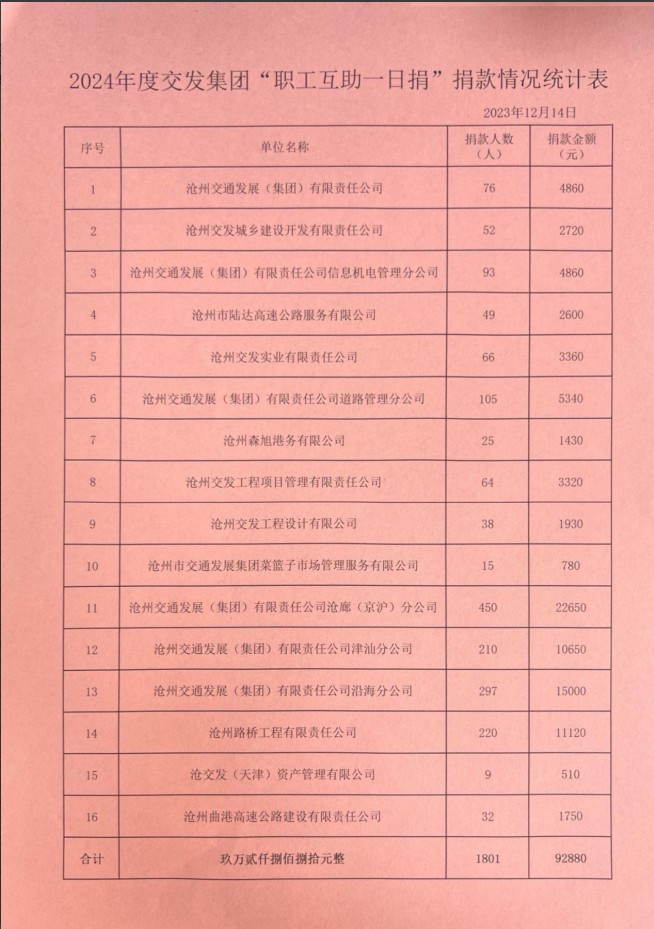 開展“職工互助一日捐”活動(dòng),是全市各級(jí)工會(huì)組織深入貫徹落實(shí)習(xí)近平新時(shí)代中國(guó)特色社會(huì)主義思想和中國(guó)工會(huì)十八大精神,積極協(xié)助黨和政府解決民生問(wèn)題,維護(hù)職工穩(wěn)定的一項(xiàng)具體舉措。滄州交通發(fā)展(集團(tuán))有限責(zé)任公司根據(jù)滄州市總工會(huì)辦公室《關(guān)于開展 2024 年度“職工互助一日捐”活動(dòng)的通知》,于2023年12月,組織開展了2024年度“職工互助一日捐”活動(dòng)。